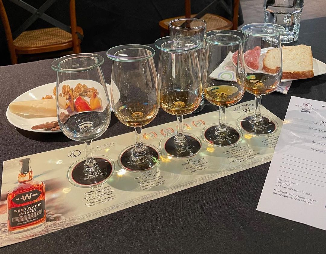 Tasting Westward American Single Malt "Ken Forkish Sourdough" Whiskey along with their whitedog, single malt, stout cask, and two-malt wheated whiskies.